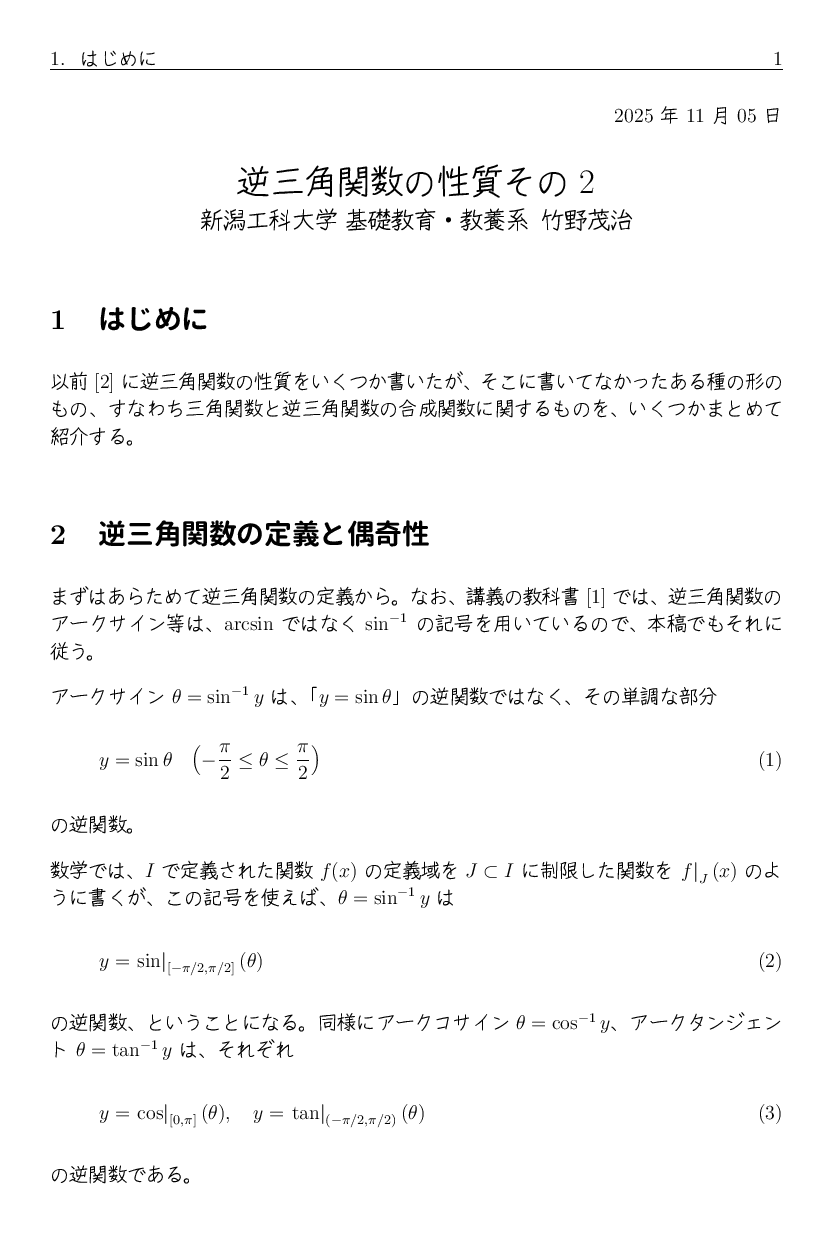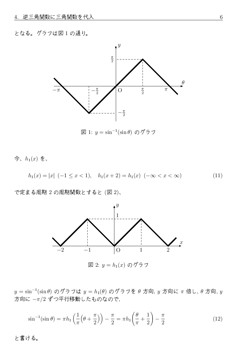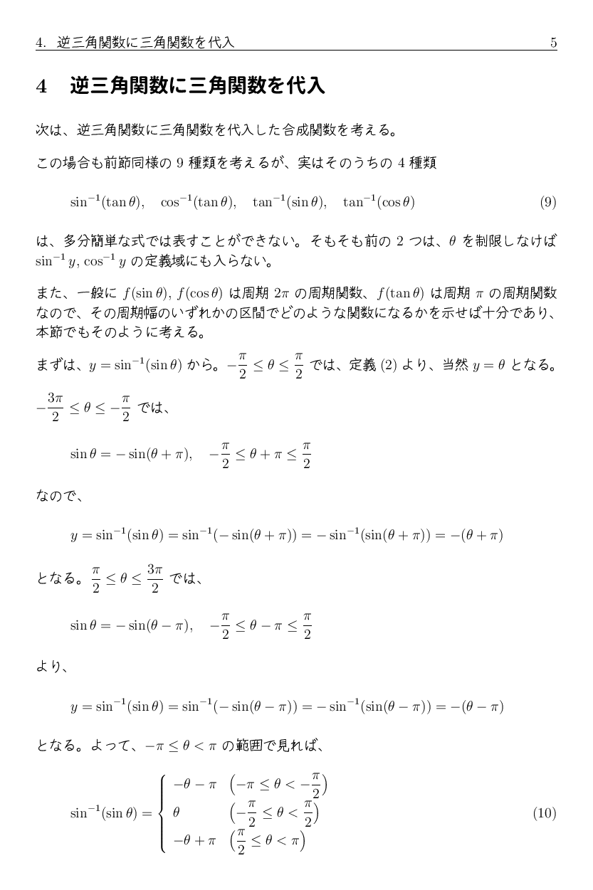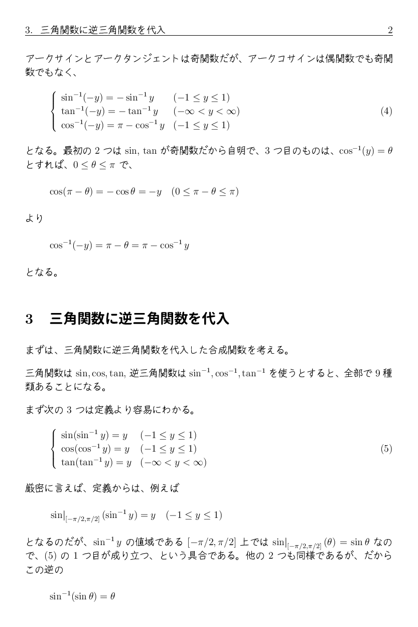 「逆三角関数の性質」 に、 三角関数と逆三角関数の合成関数に関する性質を追加します。