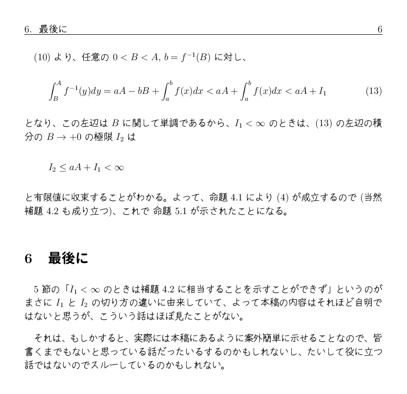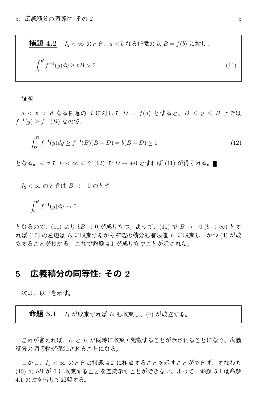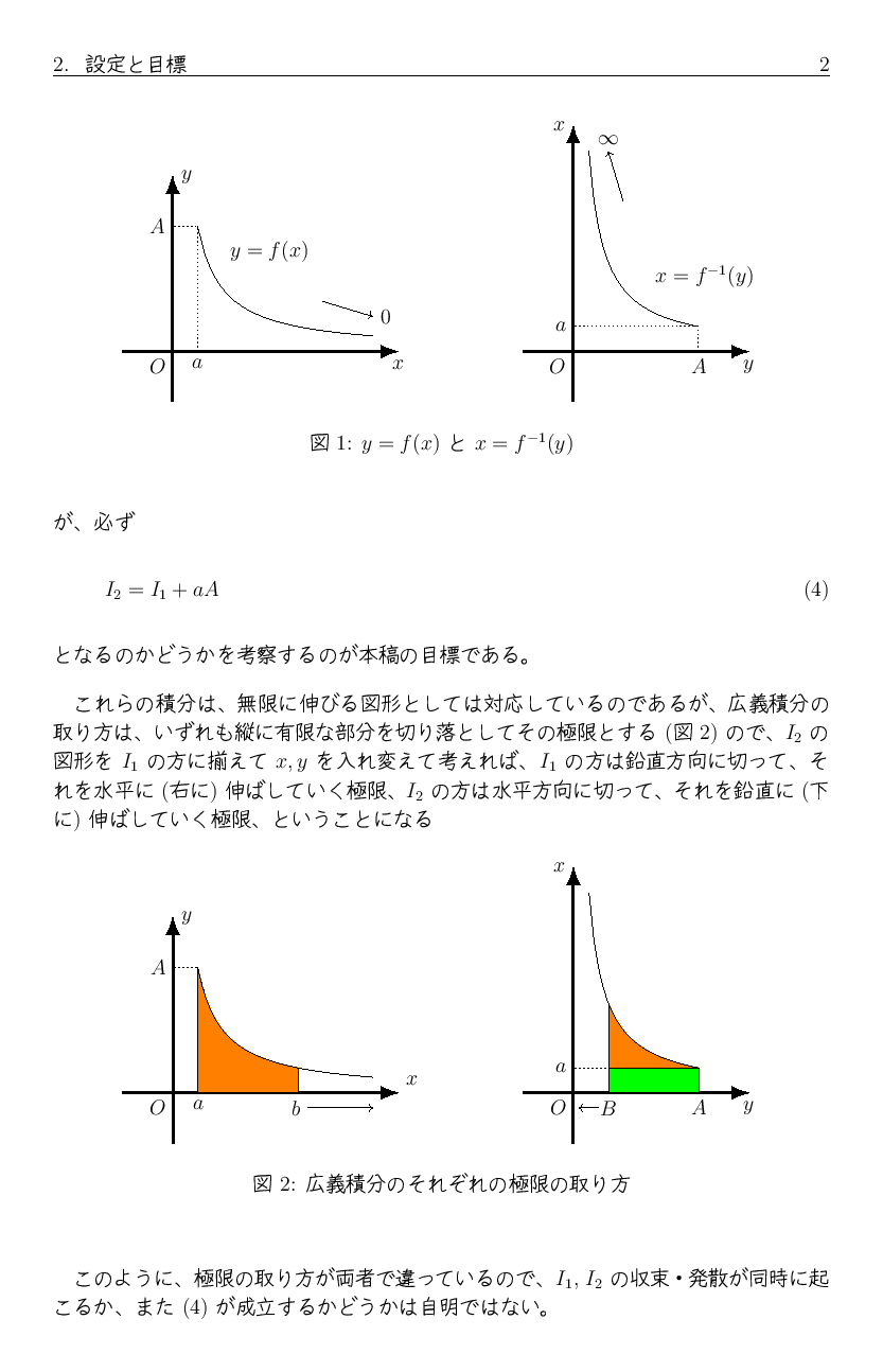 特に狭義単調関数の場合は、 その広義積分と逆関数の広義積分が同じ図形でこの 2 種類の積分になりますが、 広義積分の極限の取り方は両者で同一ではないため、 それらの値が同一であるかどうかは自明ではありません。 それについて考察してみましたので、以下に置きます。