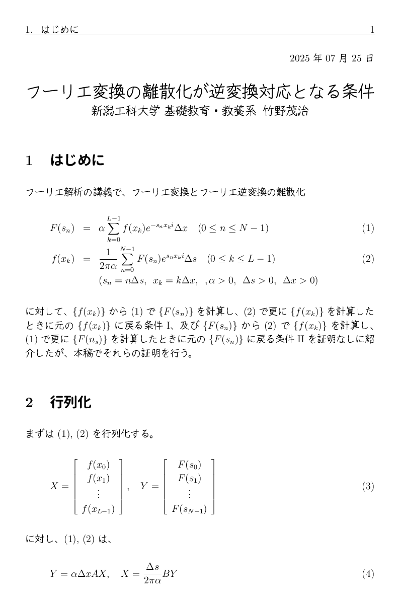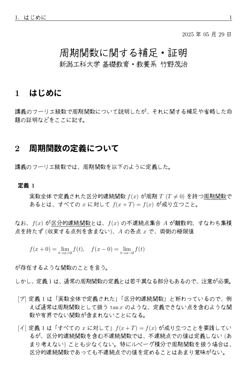 今年 (2025) は、フーリエ解析の講義をしていますが、 フーリエ級数のところで説明した周期関数について、 それに関する補足や省略した命題の証明などをここに置きます。