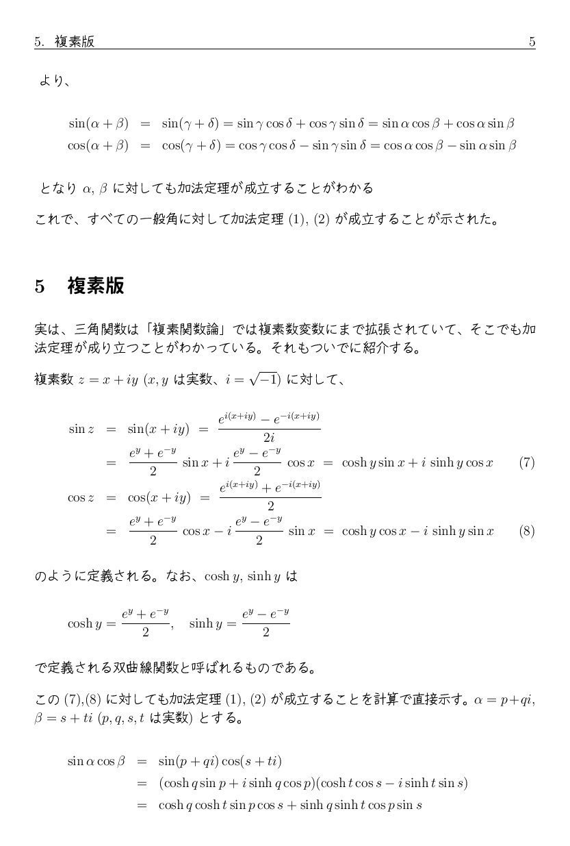 やや基礎数理 I の話とはずれるかもしれませんが、 先日ある学生に聞いた、三角関数の加法定理の覚え方について 少し考えてみました。 取り敢えずここにまとめておきます。