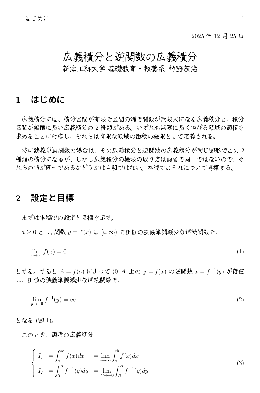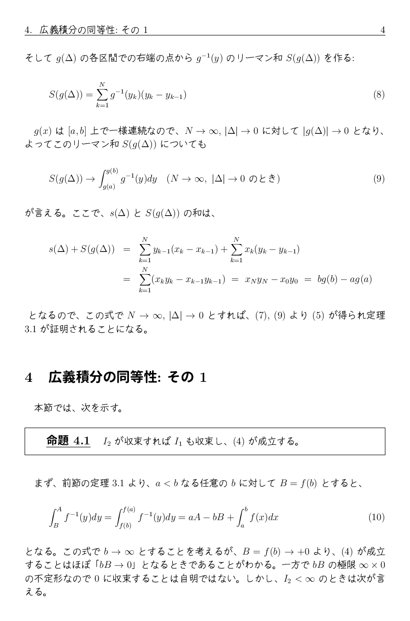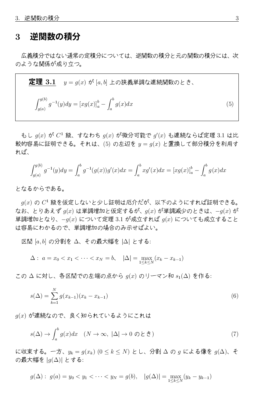 特に狭義単調関数の場合は、 その広義積分と逆関数の広義積分が同じ図形でこの 2 種類の積分になりますが、 広義積分の極限の取り方は両者で同一ではないため、 それらの値が同一であるかどうかは自明ではありません。 それについて考察してみましたので、以下に置きます。