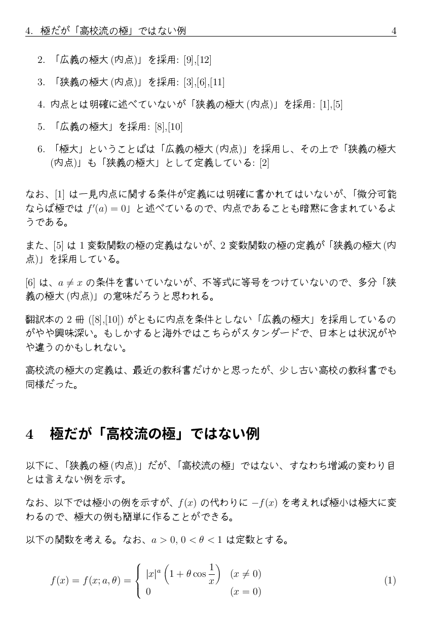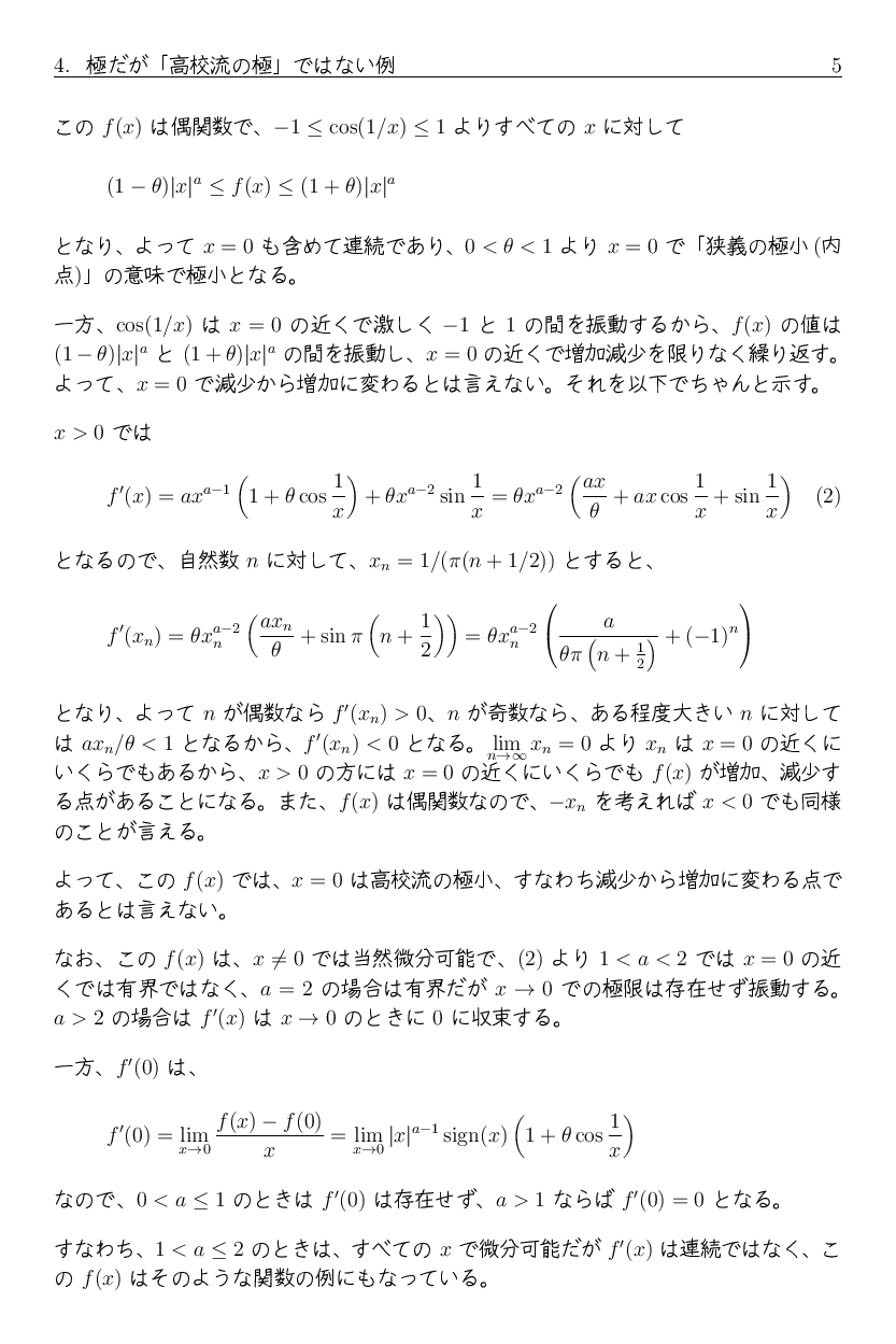 一方、増減表では、増加から減少への変わり目が極大、 減少から増加への変わり目が極小、という風に考えるので、 それが同値、すなわち「極大とは増加から減少への変わり目」と 認識している学生も少なくないような気がしますが、 実際には必ずしもそうではありません。 以下で、そのような例を紹介します。