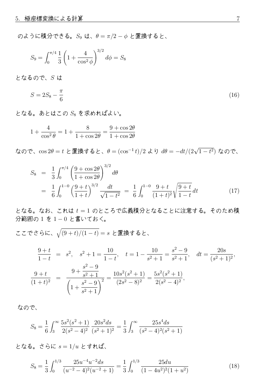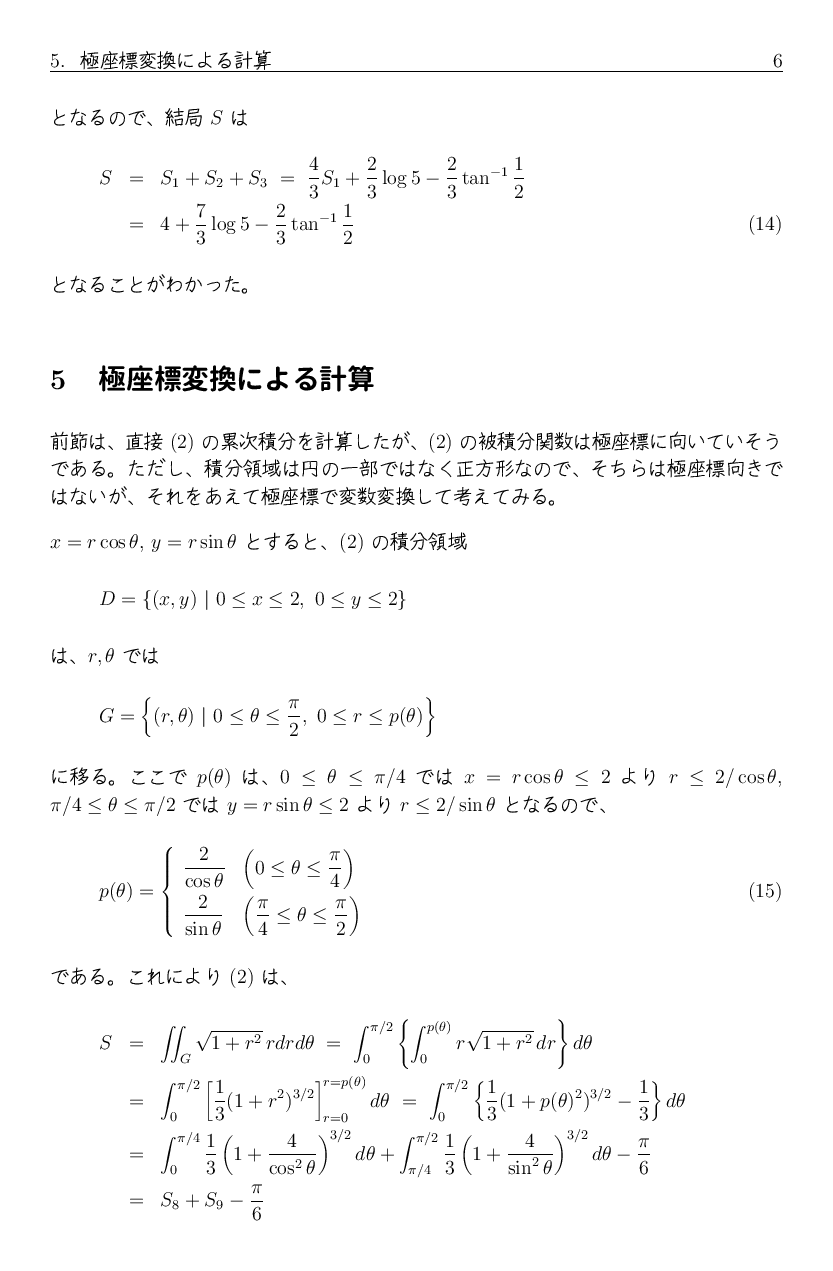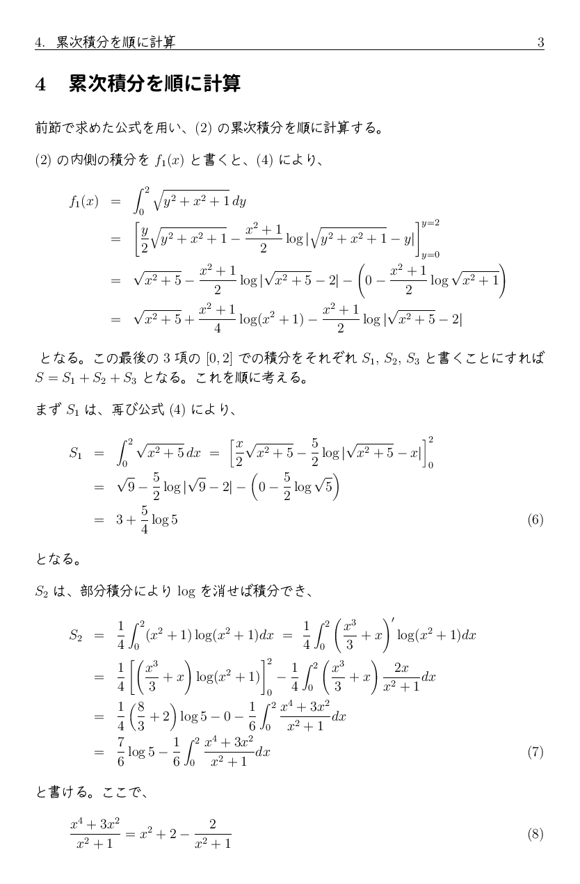 基礎数理IIIの復習問題で、\(z=x^2+y^2\) の [-1,1]×[-1,1] 上の部分の曲面積を累次積分で表わせ、という問題を出しましたが、 「実際の積分の計算は面倒」と説明しました。 せっかくなのでこれがどれくらい面倒なのか、 まとめてみましたのでここに置きます。
