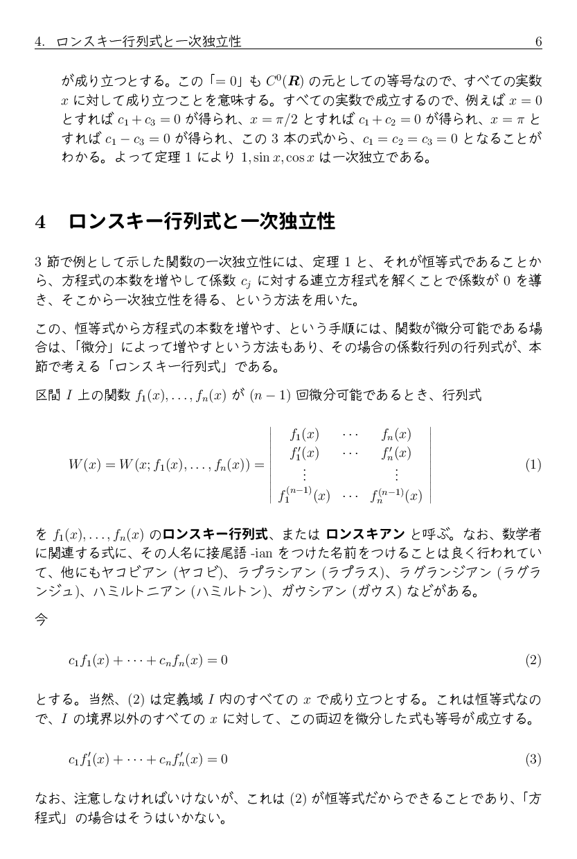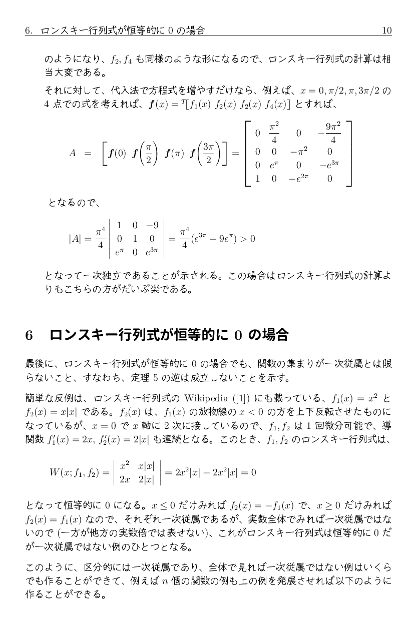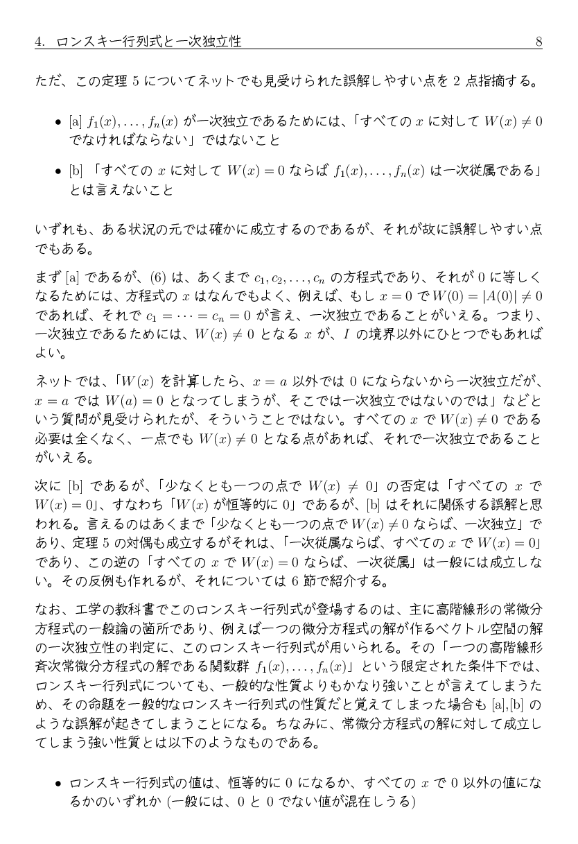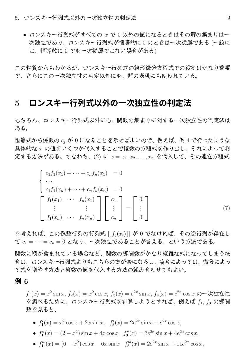 また、関数の集まりの一次独立性の判定には、 ロンスキー行列式 (ロンスキアン) が用いられることも多いのですが、 このロンスキー行列式の使い方についても誤解している質問をいくつか見ました。 それらについて少しまとめてみましたのでここに置きます。
