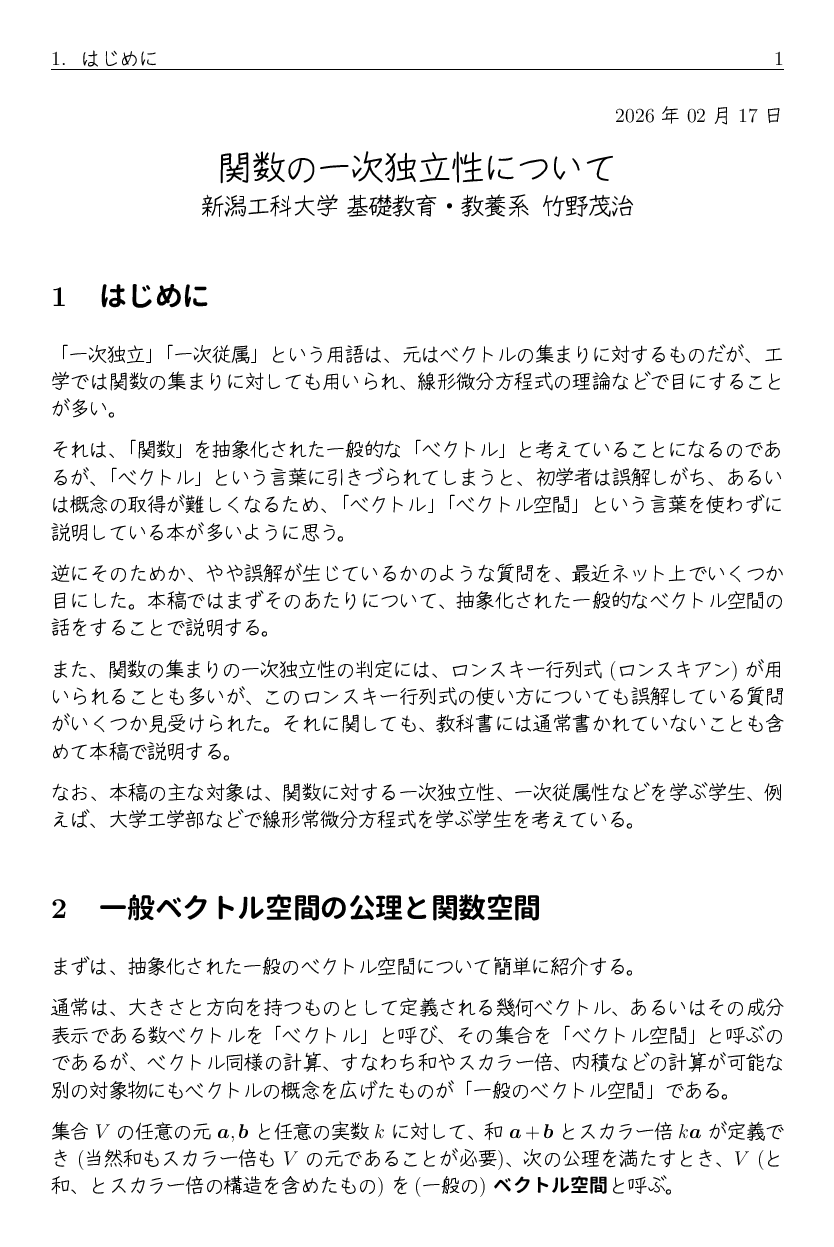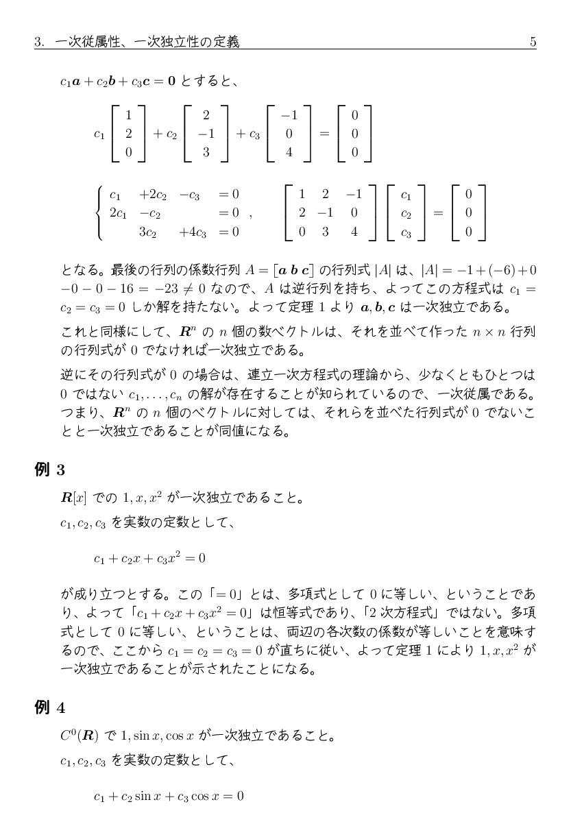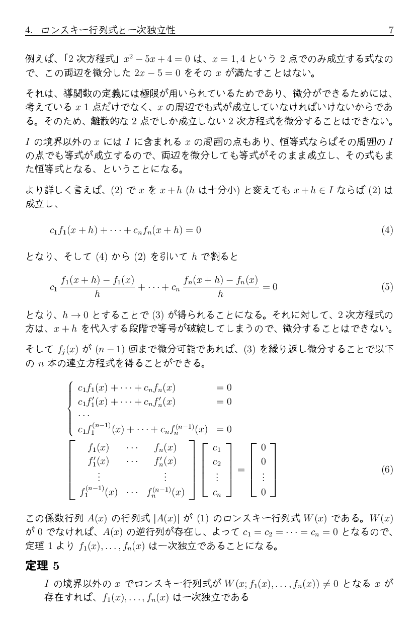 また、関数の集まりの一次独立性の判定には、 ロンスキー行列式 (ロンスキアン) が用いられることも多いのですが、 このロンスキー行列式の使い方についても誤解している質問をいくつか見ました。 それらについて少しまとめてみましたのでここに置きます。
