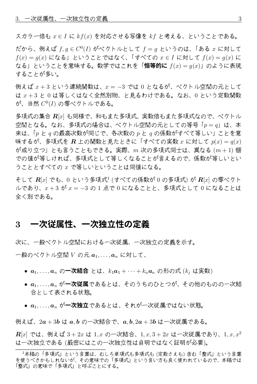 それは、 「関数」を抽象化された一般的な「ベクトル」と考えていることになるのですが、 「ベクトル」という言葉に引きづられてしまうと、 初学者は誤解しがち、あるいは概念の取得が難しくなるため、 「ベクトル」「ベクトル空間」という言葉を使わずに説明している本が多いようです。 逆にそのためか、やや誤解が生じているかのような質問を、 最近ネット上でいくつか目にしました。
